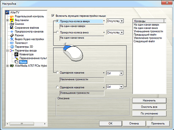 пульта ДУ и кнопок/колеса стандартной трехкнопочной мыши. Поддерживаются комбинации «кнопка мыши + кнопка-модификатор».