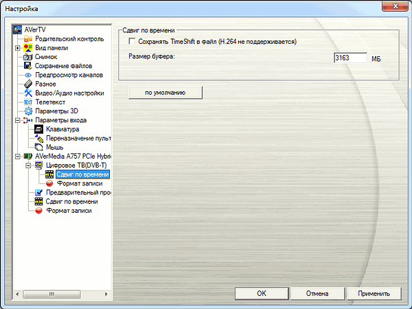 Режим отложенного просмотра TimeShift, в локализации от AVerMedia называющийся сдвигом по времени, поддерживает сохранение буферного файла в пределах заданного объема (только для MPEG2, H.264 не поддерживается).