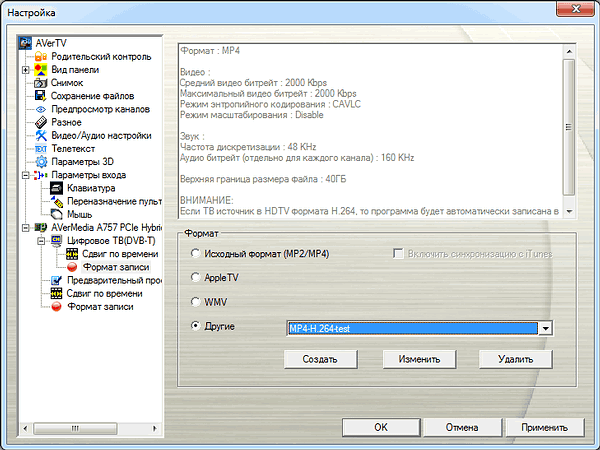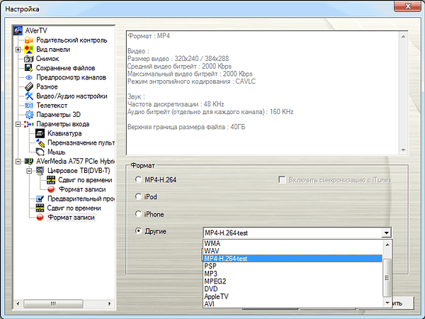 Поддерживаются запись в исходном формате, запись звука и перекодирование в WMV и H.264 с предустановленными профилями для продукции Apple, при выборе которых становится доступной синхронизация с iTunes.