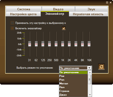 Предусмотрены 10-полосный эквалайзер с предустановленными режимами и ручным управлением, настройка баланса и раздельная регулировка громкости для левого и правого каналов.