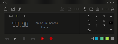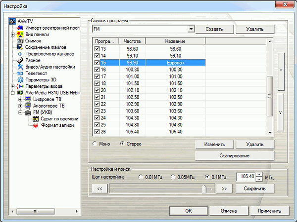 Программа использует общий интерфейс для всех режимов. В AVerTV 3D 6.5 предусмотрены готовые списки радиостанций Москвы и Санкт-Петербурга, кроме того, цифровая панель имеет два режима работы — переключение каналов и ввод частоты.