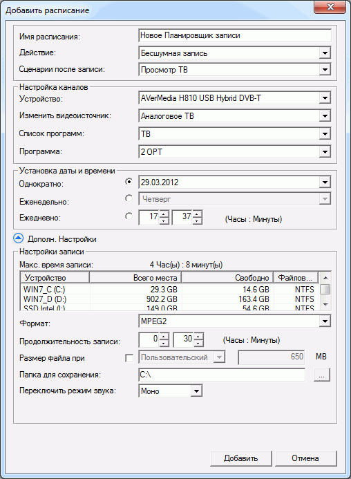 Как и в случае с режимом отложенного просмотра, видеобитрейт при использовании штатного MPEG2-кодека ограничен диапазоном 2000—15000 Кбит/с. Это не относится к частоте дискретизации (доступны 32, 44.1 и 48 кГц) и аудиобитрейту (192—384 Кбит/c). Отдельно отметим возможность использования штатного программного шумоподавления не только при просмотре, но и при записи.