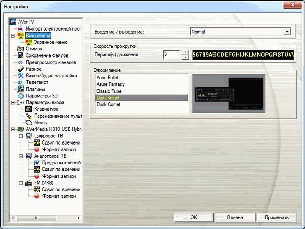 В разделе «Вид панели» находятся такие настройки интерфейса, как общее оформление (5 вариантов — Azure Fantasy, Dusk Comet, Auric Bullet, Classic Tube и схема Dark Knight, представленная на скриншоте выше), цветовая гамма экранного меню (OSD) и эффект прозрачности при вызове главной панели.