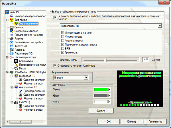Подраздел «Экранное меню» позволяет выбрать цветовую гамму, длительность отображения меню, его расположение и параметры для вывода на экран (канал, систему цветности, режим звука, информацию о телепрограмме и громкость), а также включить вывод логотипа AVerMedia.