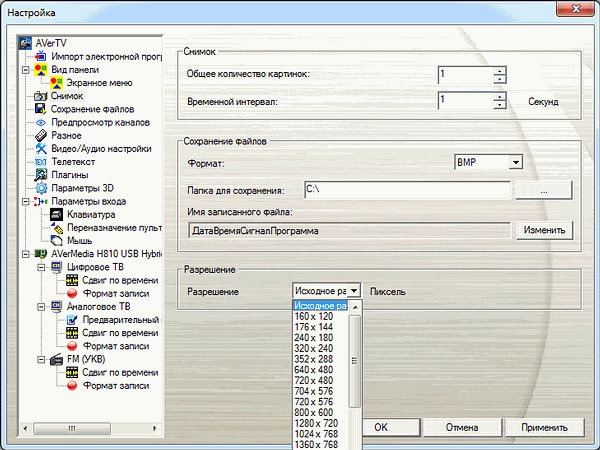 В настройках захвата кадров присутствуют количество снимков в серии, интервал между ними (от 1 до 60 секунд), формат изображения, префиксы (дата, время, сигнал, программа, пользовательский) и выбор разрешения (от 160×120 до 1600×1200). Максимальное количество скриншотов в серии составляет 100.