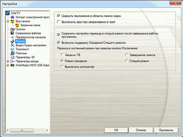 Раздел «Разное» позволяет настроить сворачивание приложения в системный трей с опциональным отключением звука. Здесь же находится поддержка энергосберегающих режимов с действиями, совершаемыми после отключения (закрыть приложение, завершить сеанс, режим ожидания, спящий режим, выключить компьютер).