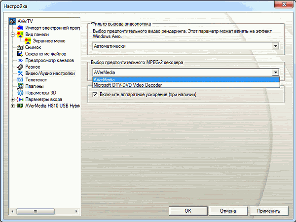 В разделе видео- и аудионастроек доступны выбор видеорендерера (автоматически, Overlay Mixer, Video Mixing Renderer и Enhanced Video Renderer при доступности последнего в системе), MPEG2-декодера (собственный декодер от AVerMedia или Microsoft DTV-DVD Video Decoder) и включение аппаратного ускорения при его наличии.