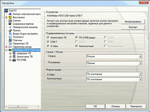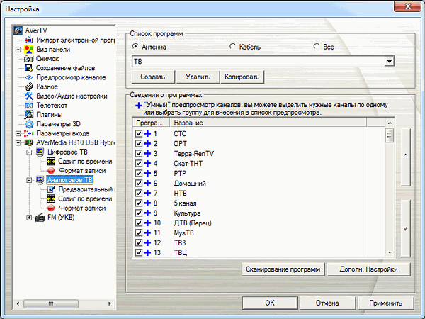 Несмотря на возможность DVB-T передавать на одной частоте как телевизионные каналы, так и радиостанции, подход AVerMedia предусматривает раздельное отображение теле- и радиоканалов как для аналогового, так и для цифрового режимов. При выборе России в качестве региона автопоиск работает корректно. Можно сохранить несколько пользовательских профилей.