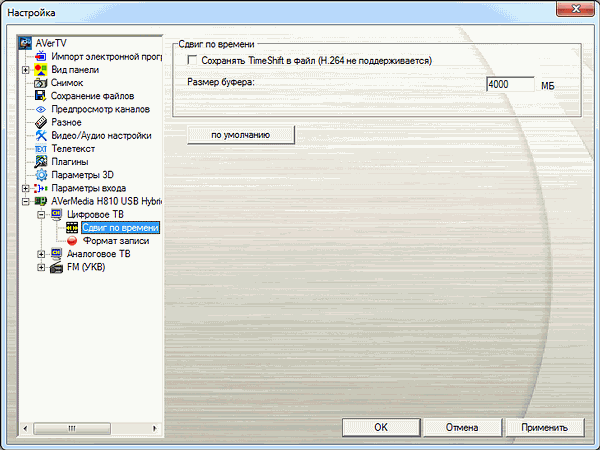 Режим отложенного просмотра TimeShift, в локализации AVerMedia называющийся сдвигом по времени, поддерживает сохранение буферного файла в пределах заданного объёма (только для MPEG2, H.264 не поддерживается).