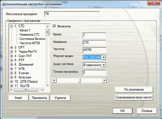В дополнительных настройках можно найти название канала (доступное для редактирования и в общем списке), частоту, индивидуальный стандарт цветности и почему-то помещённый сюда поиск по всему диапазону частот.