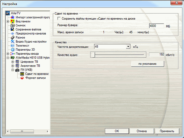 FM-режим имеет свои настройки режима сдвига по времени (используется MPEG2). В одноименном разделе можно выставить битрейт (192 — 384 Кбит/с) и частоту дискретизации (32, 44,1, 48 кГц). Сохранение буферного файла доступно и здесь.