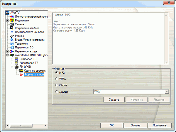 Порадуемся появлению среди форматов сжатия явно более полезного для FM-режима MP3 в Windows Vista и Windows 7 (в предыдущих версиях AVerTV сжатие в MP3 поддерживалось только в Windows XP, к тому же, системный кодек от Microsoft, ограниченный 22 кГц 56 кбит/с, требовал замены на полную версию Fraunhofer MPEG Layer-3 codec или использования альтернативных вариантов) в дополнение к WMA, WAV и H.264.