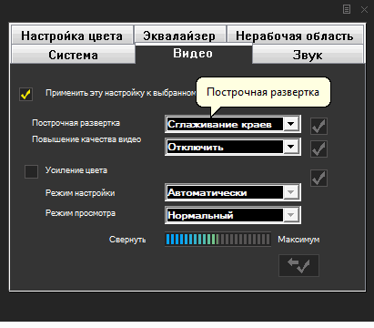 Пункт «Усиление цвета» («Video Color Enhancement» в оригинале) позволяет дополнительно управлять насыщенностью (кроме автоматической работы возможно ручная настройка, которой, впрочем, может помешать тоже давняя ошибка в локализации, ставшая причиной непонятного «Свернуть» вместо «Минимум»). В программе реализованы демонстрационные режимы с обработкой половины изображения и с разделением окна, результат представлен на скриншоте ниже. По умолчанию опция активирована, пользователям, не являющимся сторонниками чрезмерной насыщенности, не помешает это учесть.