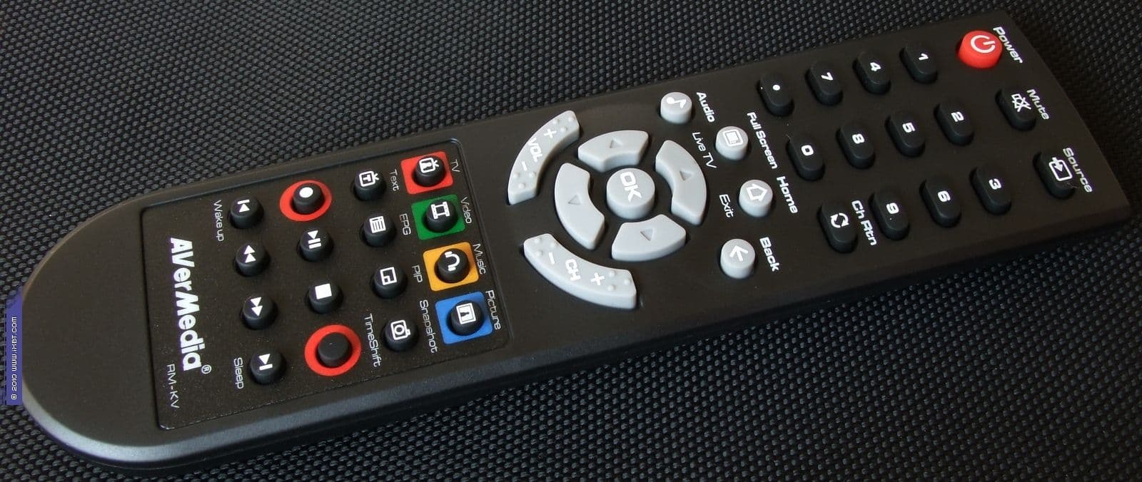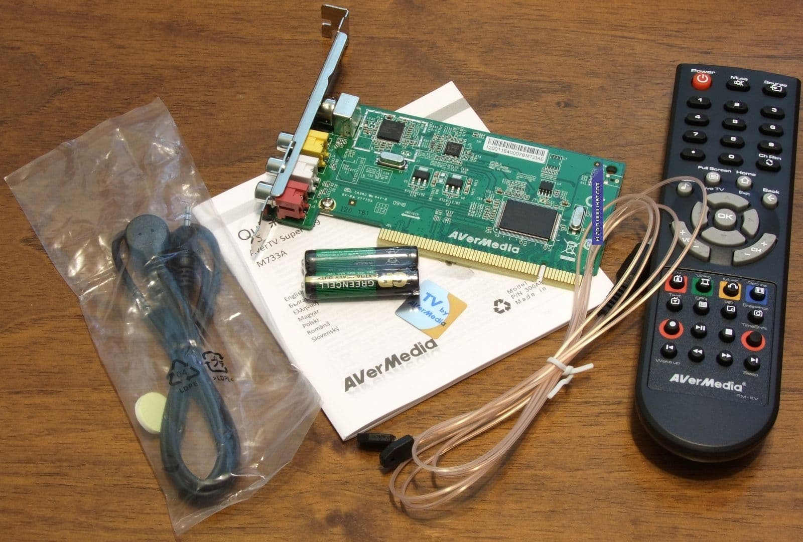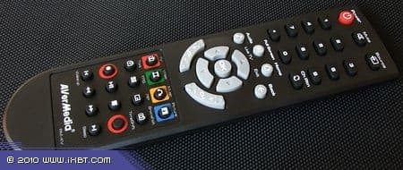 Тюнер комплектуется новым для AVerMedia (мы уже встречались с таким у KWorld PlusTV Hybrid PCI) пультом ДУ, предназначенным для работы как с AVer MediaCenter, так и с AVerTV 6. Расположение кнопок и группировка по функциональным зонам удобны, нажатие информативно. Отдельно можно отметить выделение светлых навигационных кнопок на тёмном фоне. Питание от двух элементов типоразмера AAA, входящих в комплект поставки.
