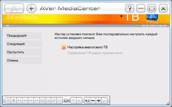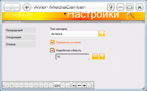 Как и AVerTV 6, AVer MediaCenter кроме выбора антенны или кабеля в качестве источника телевизионного сигнала предусматривает поиск по всему частотному диапазону.