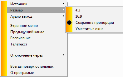 Выбор источника сигнала при помощи контекстного меню, доступного по правой кнопки мыши, идёт вразрез с общей идеологией мультимедийных оболочек. Здесь же можно выбрать соотношение сторон, включить телетекст и запустить таймер отключения (до 2 часов с интервалом в 30 минут).