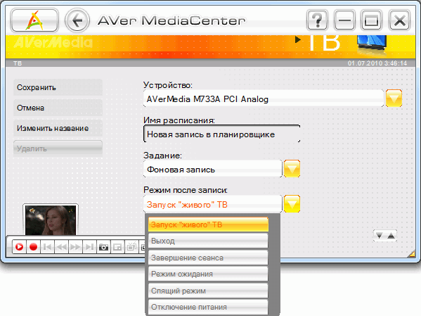 Планировщик перенесён из AVerTV 6 без существенных изменений. Реализована фоновая запись с отключенным звуком, возможен как переход в энергосберегающие режимы после выполнения запланированного задания, так и отключение компьютера.