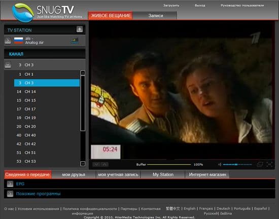 Сервис представляет собой сочетание клиентской части SnugTV Station, устанавливаемой на компьютер пользователя, и портала http://www.snugtv.com/ на котором после регистрации (требуются персональные данные) можно из любой точки подключиться к вещанию со своего тюнера или тюнера другого пользователя, разрешившего доступ. Разумеется, устройства должны быть произведены AVerMedia, список совместимых также находится на сайте вместе с подробным описанием первичной настройки.
