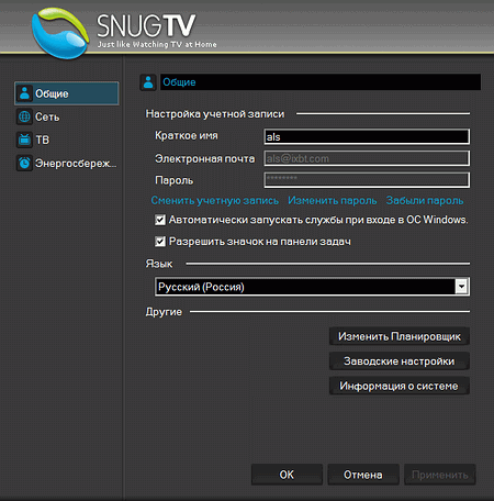 В разделе «Общие» настроек программы SnugTV Station находятся параметры учётной записи, автоматического запуска и выбор языка.