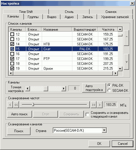 В программу заложен полный список частот без разделения на антенный и кабельный диапазон. Отдельно отметим пока еще редкую возможность индивидуальной настройки стандарта цветности для каждого канала в списке.