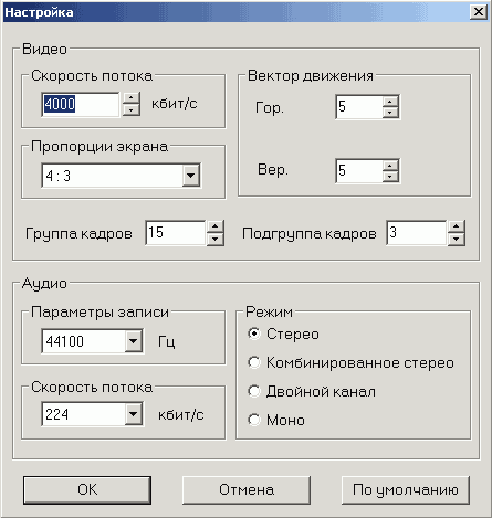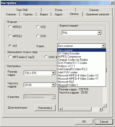 Поддерживается запись с использованием любого установленного в системе кодека