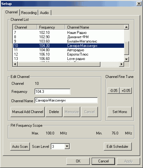 Сканирование каналов имеет рекордное количество уровней чувствительности — 10 (!), как ни странно, имеющих нумерацию по убыванию. Аналогично протекает и сам процесс сканирования — от больших частот к меньшим. Теоретически, подобрать оптимальный уровень в диапазоне от 10 (strong) до 0 (weak) вполне возможно, на практике же такое богатство сводится к тривиальному редактированию списка радиостанций вручную. Русские названия поддерживаются корректно.