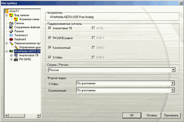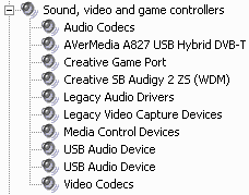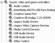После установки в разделе Sound, video and game controllers появляется устройство AVerMedia A827A USB Pure Analog (AVerTV Volar AX) или AVerMedia A827 USB Hybrid DVB-T (AVerTV Hybrid Volar HX).