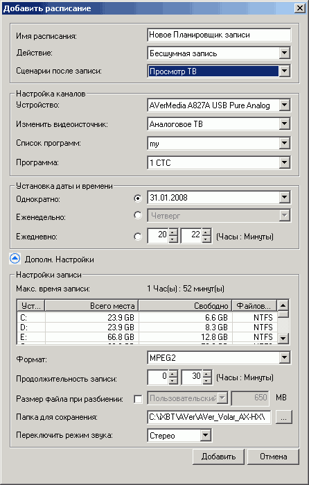 Планировщик поддерживает фоновую запись Silent Record с отключенным звуком. Существует возможность отключения компьютера/перехода в энергосберегающий режим после выполнения запланированного задания. Добавился раздел дополнительных настроек, дублирующий, в частности, такие параметры, как место хранения записи, формат и разбиение файла.