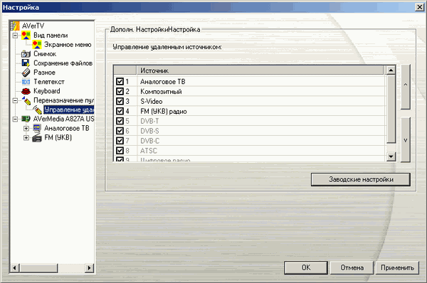 В подразделе Управление удалённым источником можно выбрать режимы работы тюнера при использовании пульта. Там же находится возврат к заводским настройкам.