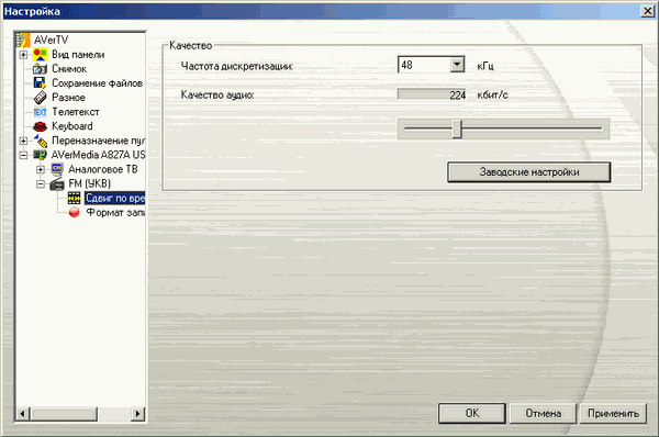 FM-режим имеет свои настройки режима отложенного просмотра, точнее прослушивания. В одноименном разделе можно выставить битрейт (192-384 Кбит/с) и частоту дискретизации (32, 44.1, 48 кГц).