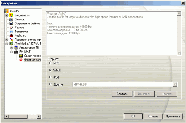 К нескольким стандартным профилям, представленным в разделе Формат записи можно добавлять пользовательские. Поддерживаются сторонние кодеки, установленные в системе, с настройкой дополнительных параметров.