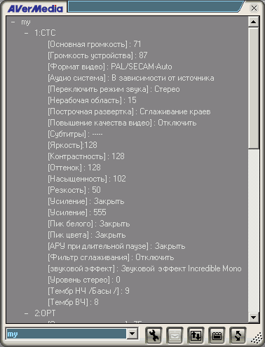 Остальные настройки, изменяемые для каждого канала индивидуально, вызываются при помощи специальной кнопки на панели интерфейса. Таким образом, к стандарту цветности и режимам звука добавляются яркость, контраст, оттенок, насыщенность, резкость, масштабирование (overscan), тип деинтерлейсинга (Bob, Weave, краевое сглаживание) и названное в русском варианте Повышением качества видео шумоподавление (включено, выключено, автоматический выбор).