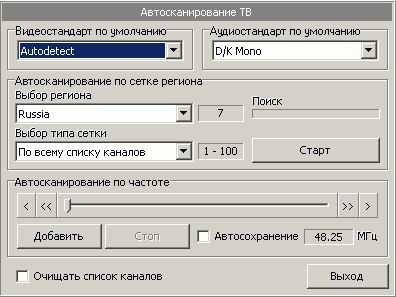 В случае несовпадения сетки вещания практической пользы от этого немного, зато есть повод проверить работу алгоритмов поиска. Сканирование возможно, как по списку каналов, так и по частоте с шагом в 0,25 МГц.