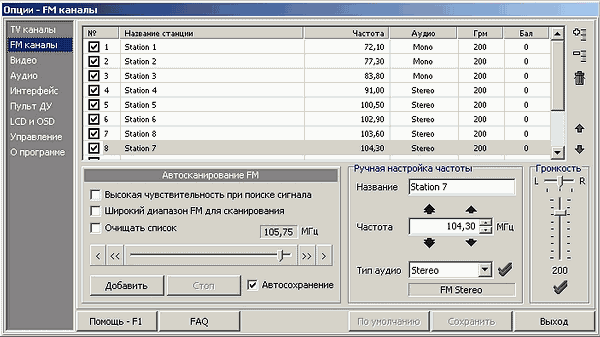 - Индивидуальные настройки частоты, типа аудиосистемы, громкости и аудиобаланса для каждой радиостанции