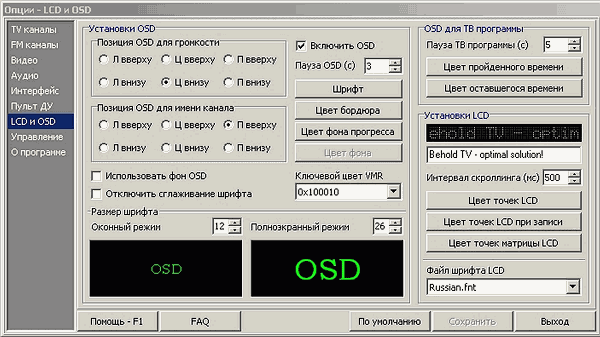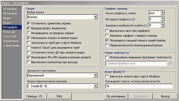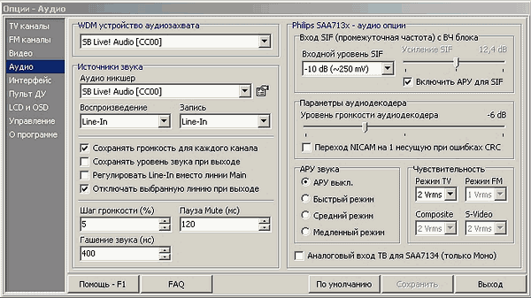 Из звуковых настроек следует отметить захват аудиосигнала при декодировании с промежуточной частоты тюнера и переход NICAM на первую несущую при ошибках CRC (при этом запрещается декодирование стереозвука, так что включение данной опции рекомендуется только в случае проблем с приемом стерео). Естественно, эти настройки доступны только для модели на SAA7134HL.
