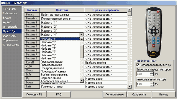 Программа позволяет гибко настраивать, как кнопки пульта ДУ, так и задержку перед повтором, и интервал автоповтора.