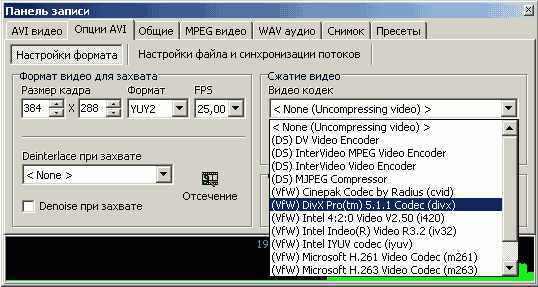 Захват возможен с любым установленным в системе кодеком. Поддерживается шумопонижение и отсечение краев.