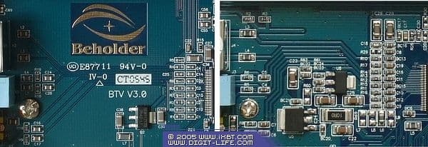 - Улучшена разводка аналоговых сигнальных цепей с учётом правил распространения сигналов в длинных линиях. Это хорошо заметно, например, по изменению коммутации аналоговых входов тюнера с чипсетом (справа — Behold TV 409). Выгравированный логотип к мероприятиям, направленным на улучшение качества изображения, не относится, но внимание на себя обращает.