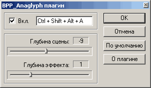 Опция Глубина сцены определяет общее положение сцены относительно плоскости экрана. Если у стереоочков левое стекло красное, а правое сине-зелёное, то при отрицательном значении этого параметра сцена отодвигается за плоскость экрана, что наиболее удобно для восприятия.