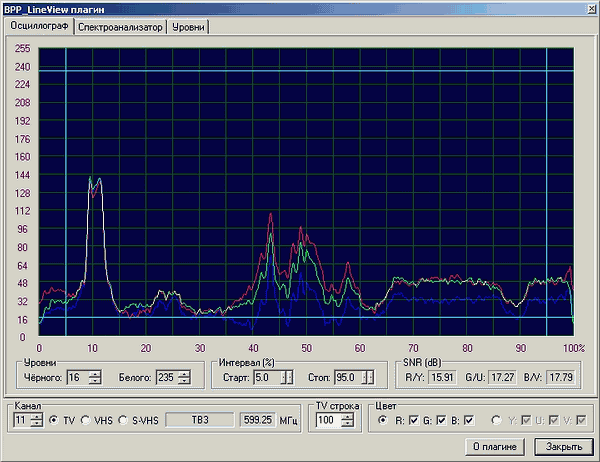 В первую очередь хотелось бы отметить BPP_LineView, предназначенный для измерения параметров произвольной видимой строки телевизионного кадра. Модуль позволяет измерить отношение сигнал/шум на любом участке строки, а также просмотреть спектр и уровни распределения для каждого отдельно взятого RGB/YUV компонента телевизионного сигнала.