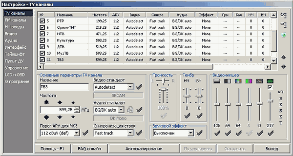 - Индивидуальные настройки стандарта цветности, изображения и звука для каждого канала