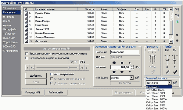 Behold TV 507 RDS обеспечивает хорошее качество звука (скачать 20-секундный фрагмент, MP3, 475 КБ). Не стоит забывать и о возможностях SAA7135HL. Отметим, что настройки дополнительной обработки звука доступны индивидуально для каждой радиостанции.