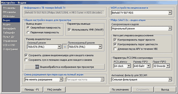 Раздел видеонастроек пополнился настройкой PCI Latency, изменение которой способно помочь в случае возникновения проблем с работой тюнера на некоторых конфигурациях. Установленное значение сохраняется в драйвере. Для регулировки PCI Latency требуется WDM драйвер от 2.7.1.0 или выше, более ранние версии не поддерживаются.