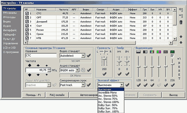 Так, в списке каналов, наконец-то, появилась возможность индивидуальной установки параметров дополнительной обработки звука (подробности можно найти в обзоре Behold TV 409 FM). Описание эффектов обработки звука и примеры реализации можно найти в обзоре GOTVIEW PCI 7135. Напомним, что поканальная регулировка остальных настроек (яркость, контраст, оттенок, насыщенность, резкость, уровень усиления) поддерживалась в программе и раньше.
