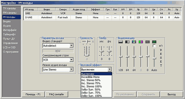Стандарт стереозвука NICAM, принятый в России в качестве государственного, работает с частотой дискретизации 32 кГц. Таким образом, в данном случае использование АЦП с поддержкой 48 кГц не дает никакого преимущества в качестве звука при работе с NICAM Stereo (при последующей обработке записанного контента эта возможность может быть полезна). К счастью, настройки тембра, баланса и эффекты дополнительной обработки звука могут быть востребованы независимо от стандарта стереозвука и от его наличия, в принципе.