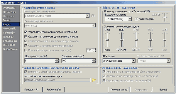 - Оцифровка звука с использованием внутреннего АЦП чипсета Philips SAA7135 с частотой дискретизации до 48 кГц