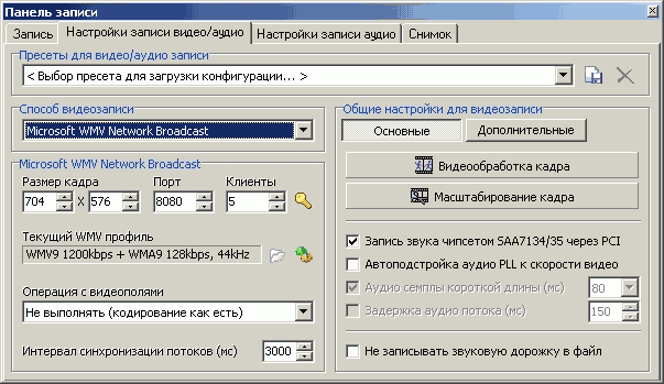 Для видеозаписи используется общее для всех форматов окно с возможностью настройки параметров используемого кодека. В настоящее время ликвидировано конкурентное отставание в области передачи видео- и аудиопотока в сеть.