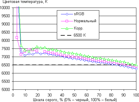 Ручная коррекция привела точку белого к стандартным 6500 К, убрала отклонение от спектра абсолютно черного тела, но небольшой рост цветовой температуры по мере уменьшения светлоты на шкале серого не устранила.