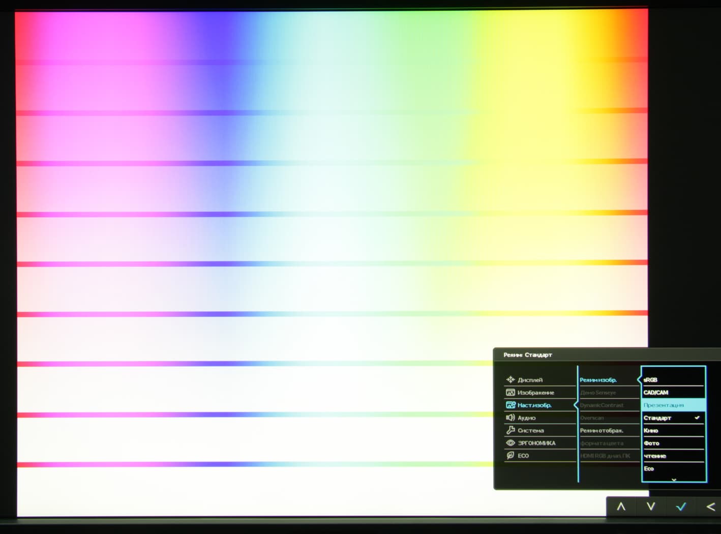Специальный режим CAD/CAM, по всей видимости, отличается тем, что в нем искусственно завышена насыщенность цветов, это позволяет лучше различать цветные линии промежуточных оттенков. Для наглядности приведем фотографии тестового изображения, полученные в режиме sRGB: