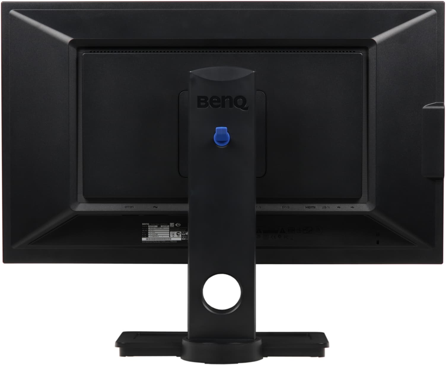 Конструкция подставки достаточно жесткая. Стоит монитор устойчиво. Отходящие кабели можно пропустить через большое круглое отверстие в стойке. Не обошлось и без фирменной детали от BenQ — отсоединяемого крюка для наушников синего цвета.
